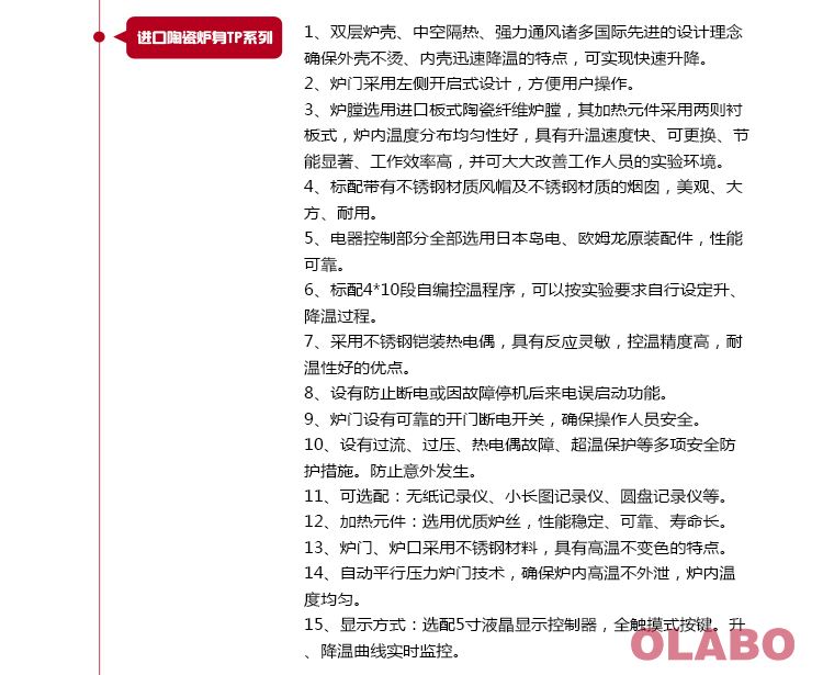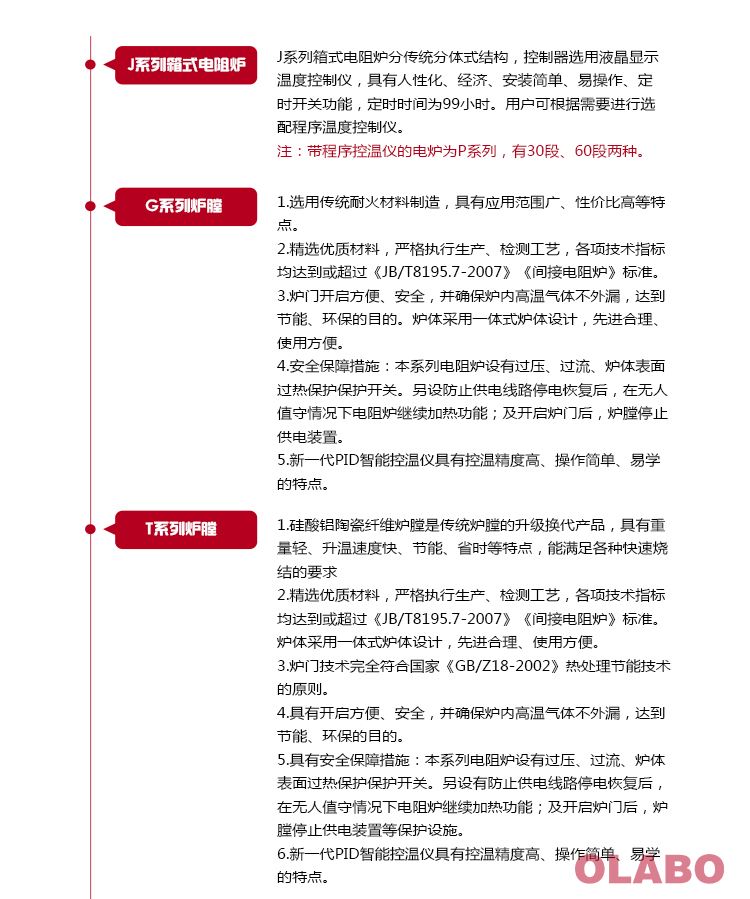 5、具有安全保障措施:本系列電阻爐設有過壓、過流、爐體表面過熱保護保護開關。另設有防止供電線路停電恢復后,在無人值守情況下電阻爐繼續(xù)加熱功能;及開啟爐門后,爐膛停止供電裝置等保護設施。